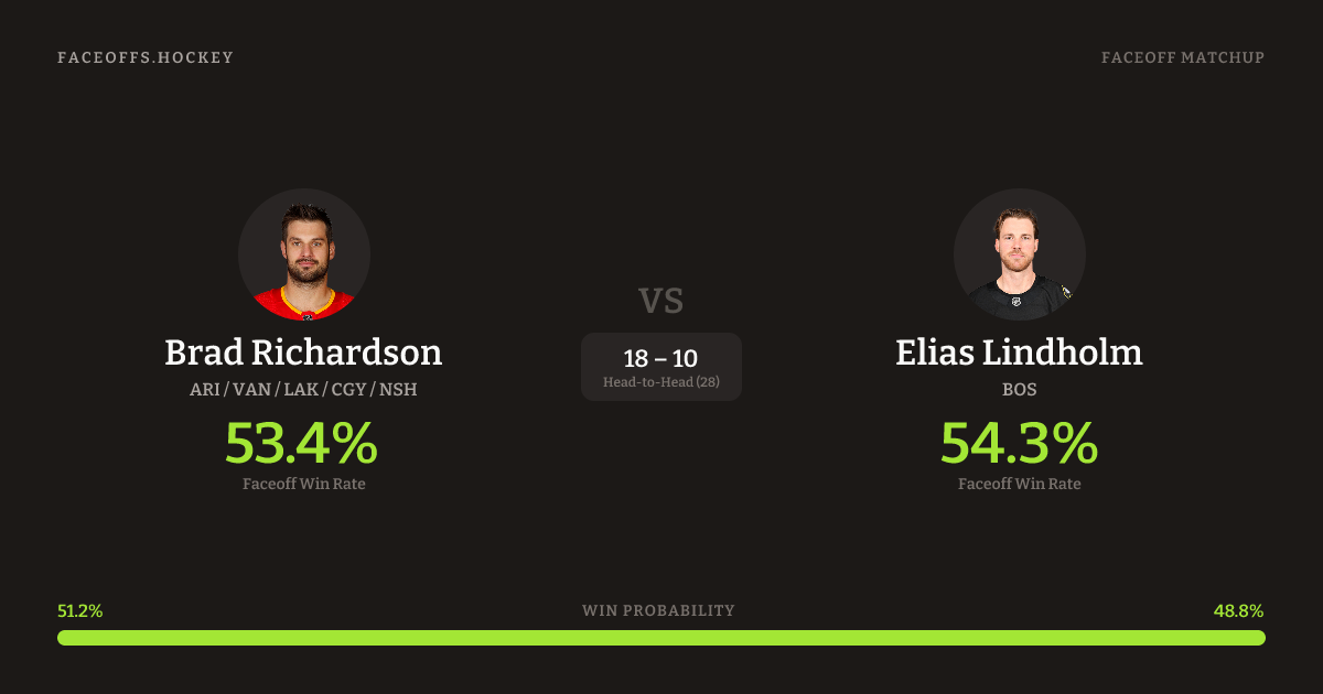 Brad Richardson holds a +4.7% FO% edge overall. Look for Richardson on offensive-zone draws (100% H2H, 3 meetings). Richardson wins 56.6% vs right-shot opponents — Lindholm shoots right.