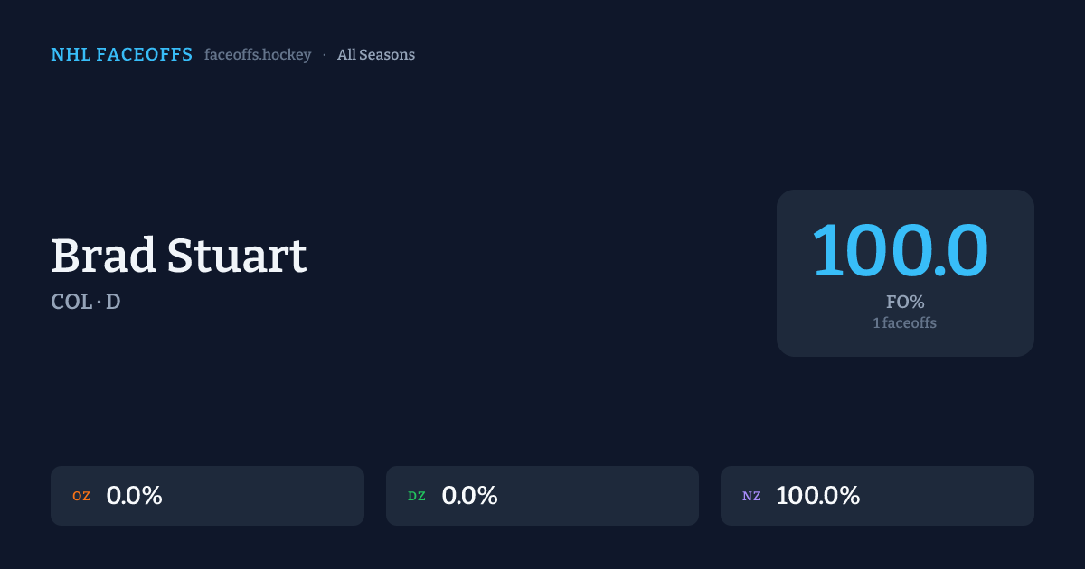 Brad Stuart has a 2014-15 faceoff win percentage of 100.0% across 1 faceoffs in the 2014-15 season. Best zone: Neutral (100.0%).