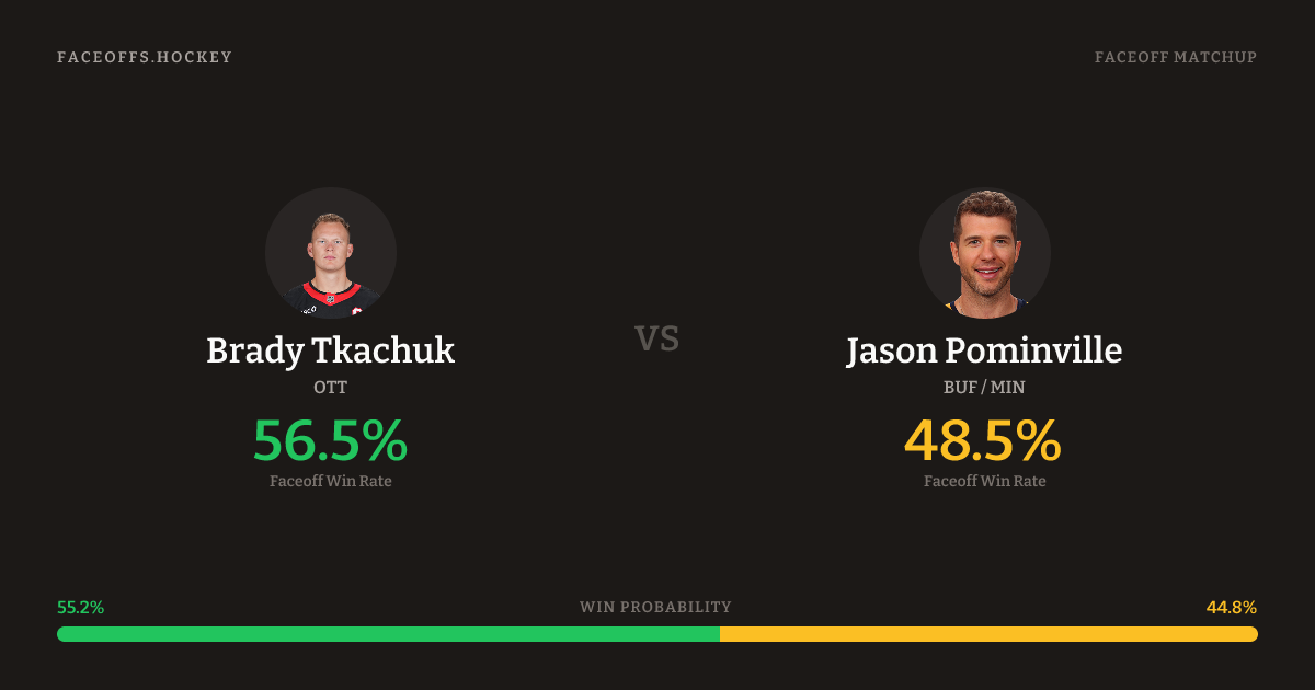 Brady Tkachuk holds a +1.2% FO% edge overall. Tkachuk wins 44.5% vs right-shot opponents — Pominville shoots right.