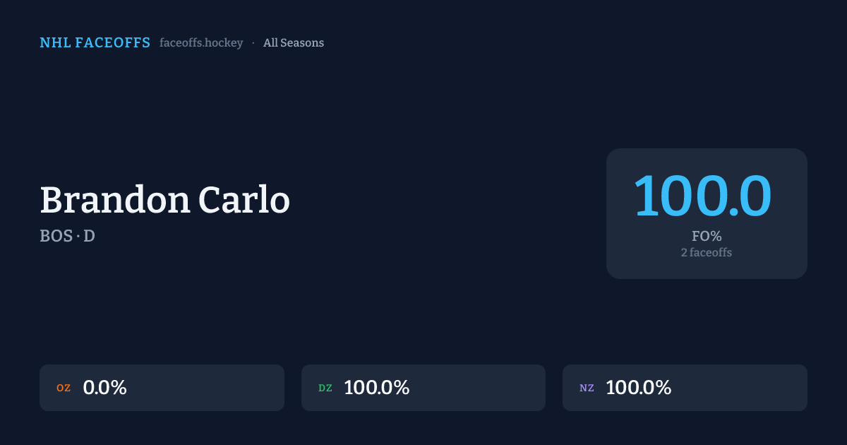 Brandon Carlo has a 2018-19 faceoff win percentage of 100.0% across 1 faceoffs in the 2018-19 season. Best zone: Defensive (100.0%).