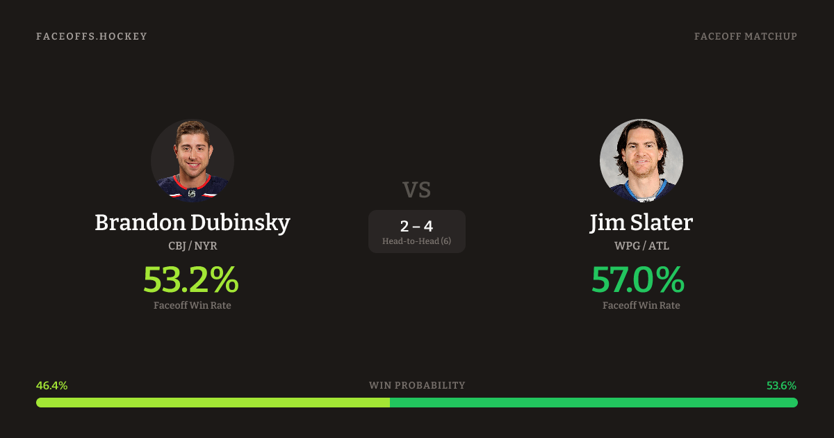 Dubinsky shoots left. Slater is 54.7% vs left-shot opponents (750).