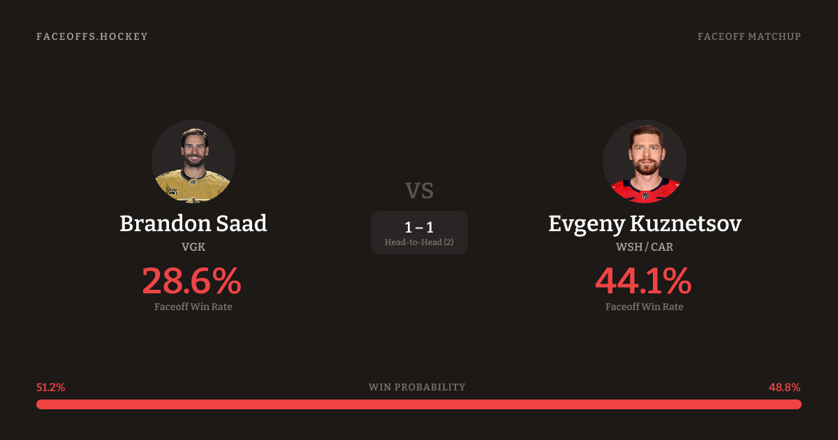 Evgeny Kuznetsov holds a +2.3% FO% edge overall. Saad wins 42.7% vs left-shot opponents — Kuznetsov shoots left.