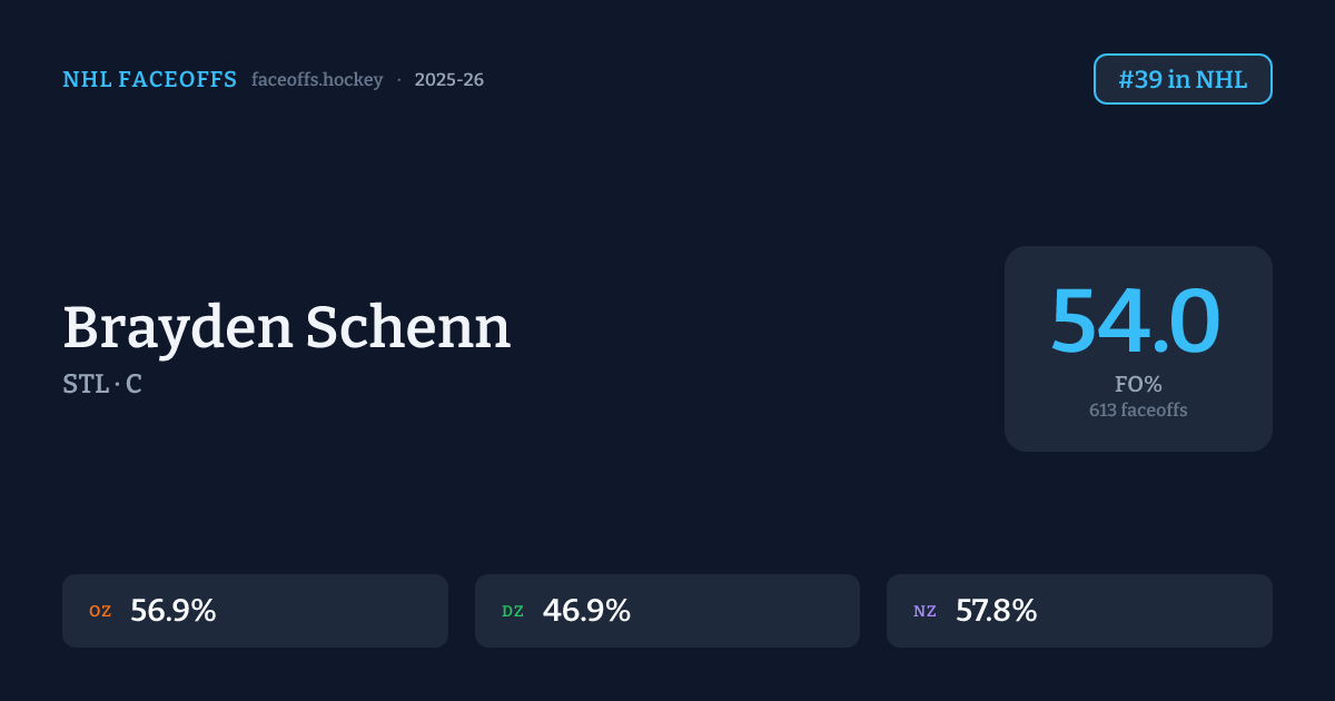 Brayden Schenn has a 2025-26 faceoff win percentage of 54.0% across 613 faceoffs in the 2025-26 season. Best zone: Neutral (57.8%). Ranked #39 in the league.