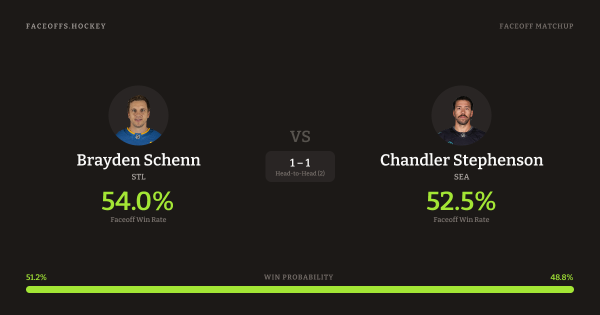 Brayden Schenn holds a +3.7% FO% edge overall. Look for Stephenson on neutral-zone draws (100% H2H, 3 meetings).