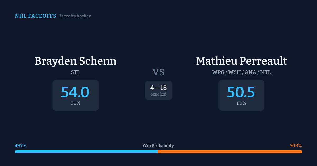 Mathieu Perreault holds a +4.7% FO% edge overall. Schenn wins 45.1% vs left-shot opponents — Perreault shoots left.