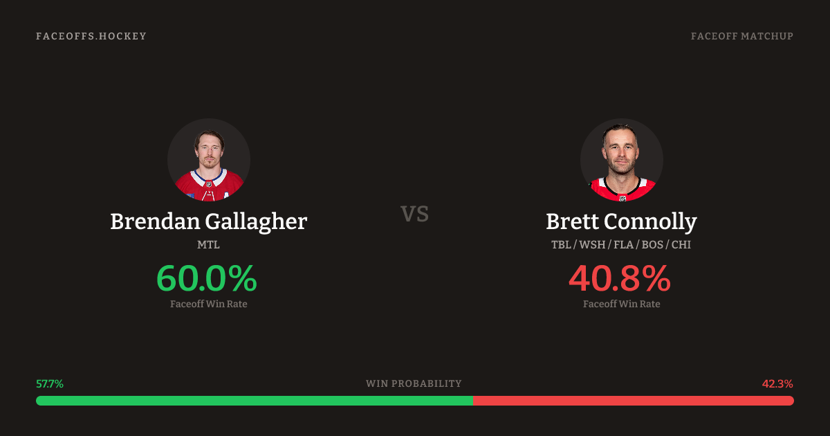 Brendan Gallagher holds a +1.5% FO% edge overall. Gallagher wins 45.0% vs right-shot opponents — Connolly shoots right.