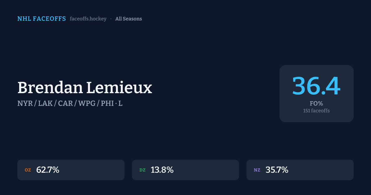 Brendan Lemieux has a career faceoff win percentage of 36.4% across 151 faceoffs. Best zone: Offensive (62.7%).