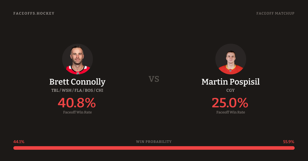 These two are closely matched in overall FO% (40.8% vs 41.5%). Connolly wins 38.9% vs left-shot opponents — Pospisil shoots left.