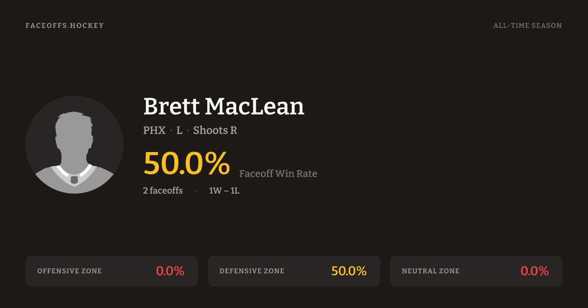 Brett MacLean has a 2010-11 faceoff win percentage of 50.0% across 2 faceoffs in the 2010-11 season. Best zone: Defensive (50.0%).