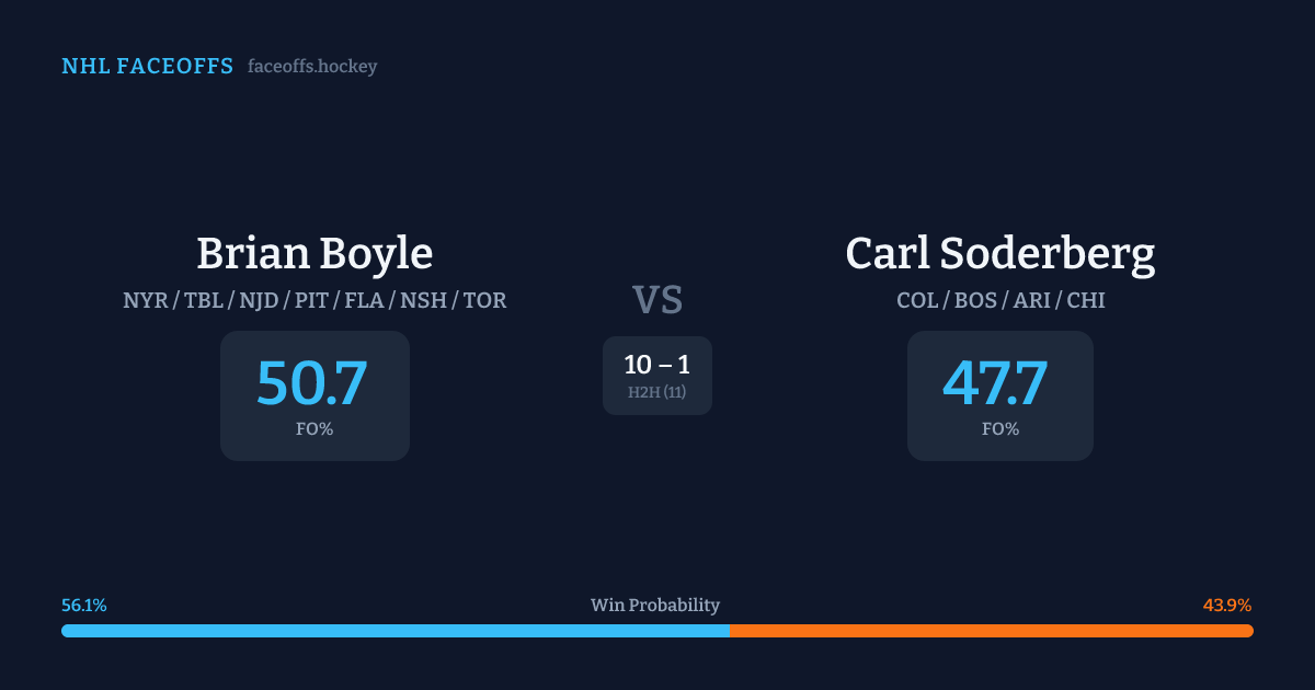 Brian Boyle holds a +2.6% FO% edge overall. Look for Boyle on neutral-zone draws (100% H2H, 3 meetings).