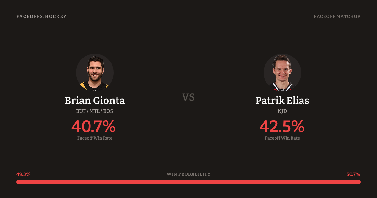 Patrik Elias holds a +1.8% FO% edge overall. Gionta wins 39.7% vs left-shot opponents — Elias shoots left.
