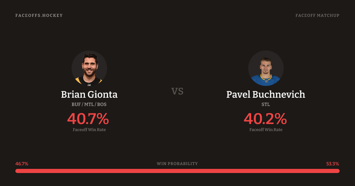 Brian Gionta holds a +6.8% FO% edge overall. Gionta wins 39.7% vs left-shot opponents — Buchnevich shoots left.