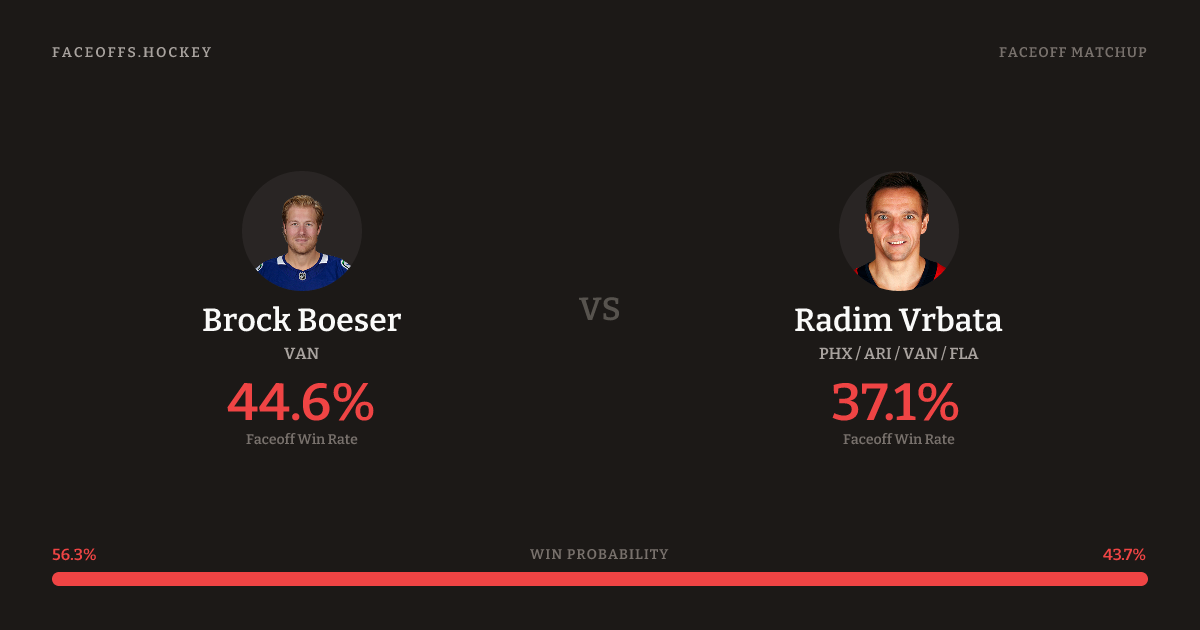 Brock Boeser holds a +3.3% FO% edge overall. Boeser wins 36.5% vs right-shot opponents — Vrbata shoots right.