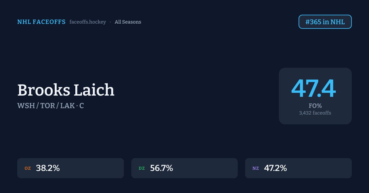 Brooks Laich has a career faceoff win percentage of 47.4% across 3,432 faceoffs. Best zone: Defensive (56.7%). Ranked #365 in the league.