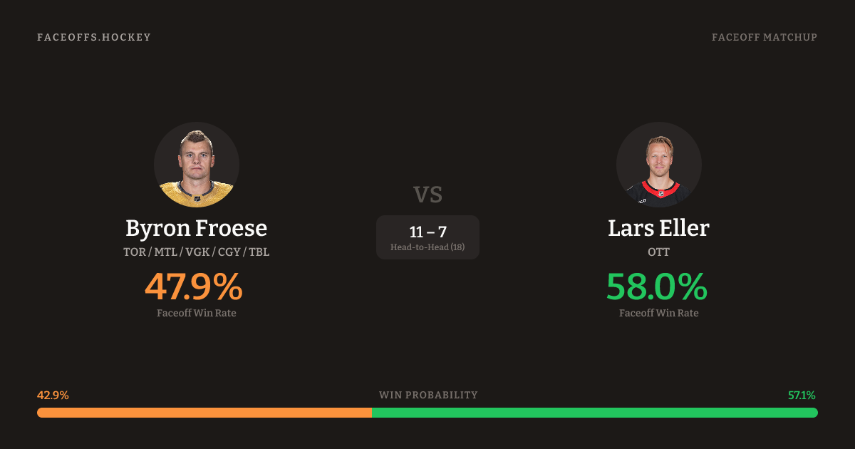 Lars Eller holds a +2.3% FO% edge overall. Look for Eller on offensive-zone draws (100% H2H, 4 meetings). Froese wins 46.2% vs left-shot opponents — Eller shoots left.