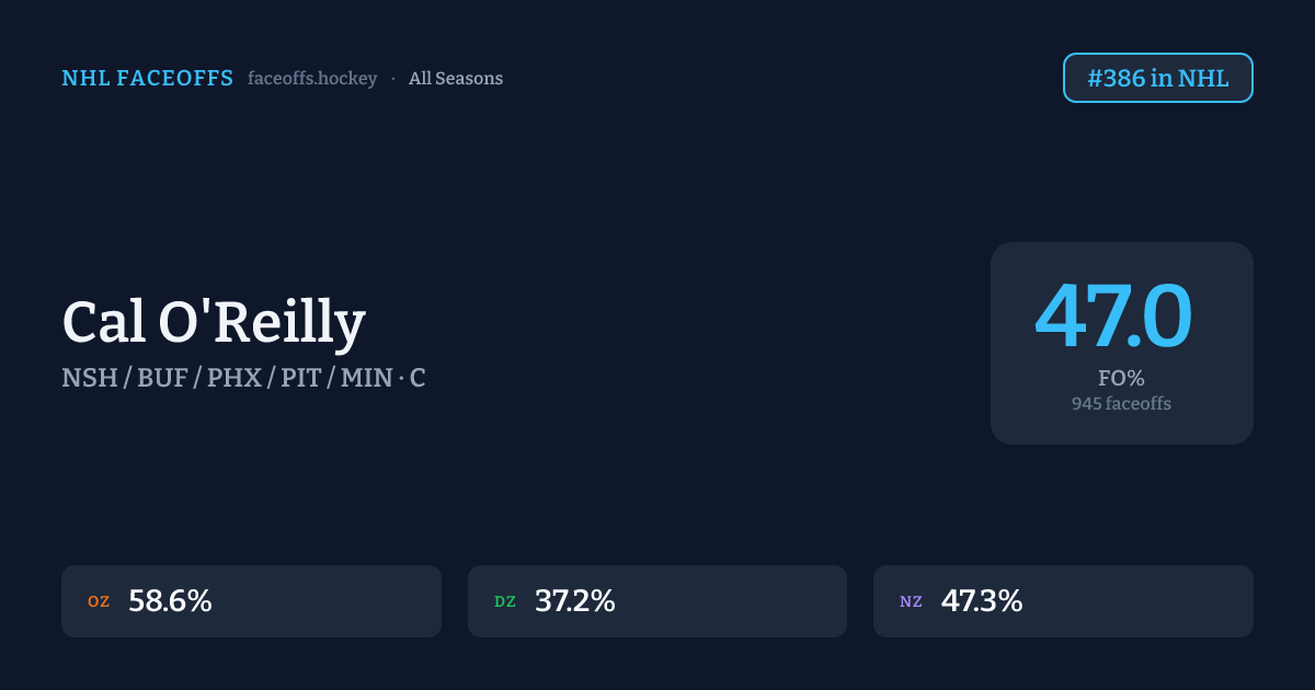Cal O'Reilly has a 2011-12 faceoff win percentage of 44.8% across 268 faceoffs in the 2011-12 season. Best zone: Offensive (50.8%). Ranked #151 in the league.