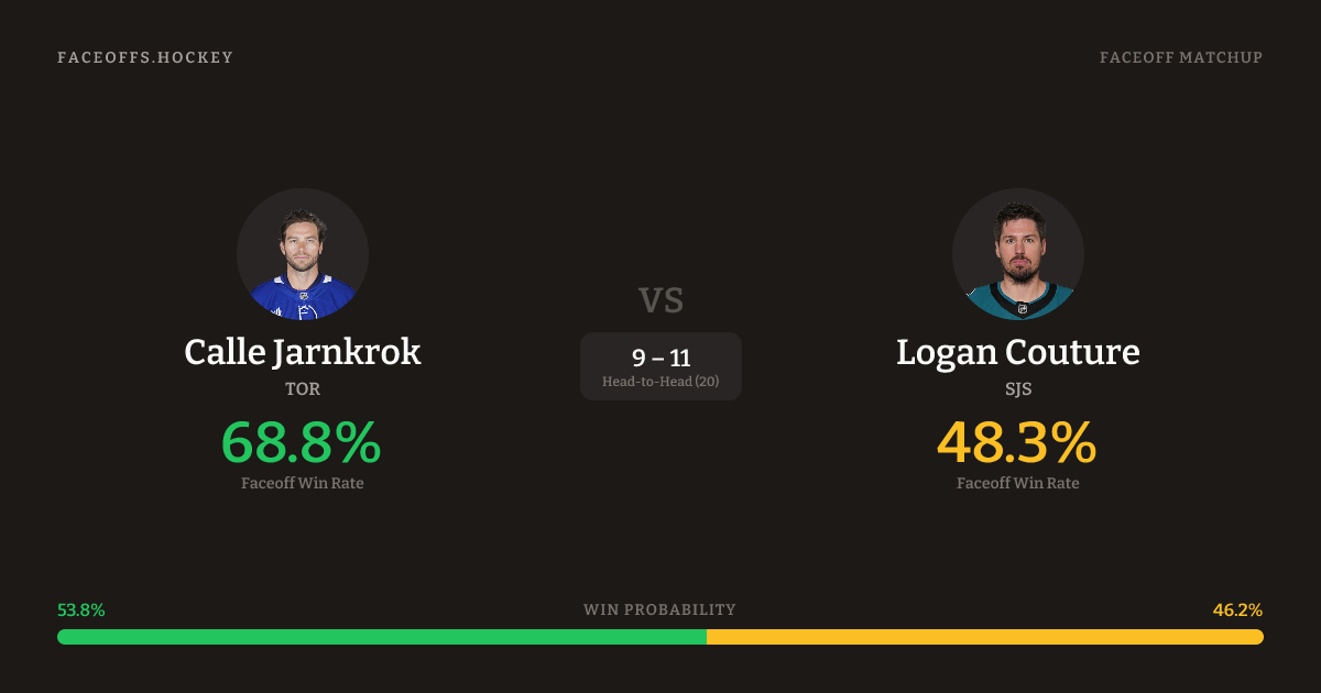 Calle Jarnkrok holds a +2.5% FO% edge overall. Look for Couture on neutral-zone draws (75% H2H, 4 meetings). Jarnkrok wins 54.5% vs left-shot opponents — Couture shoots left.