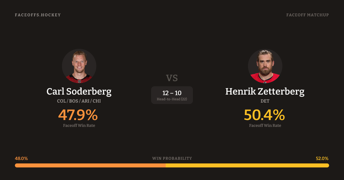 Henrik Zetterberg holds a +2.6% FO% edge overall. Look for Soderberg on neutral-zone draws (100% H2H, 3 meetings).