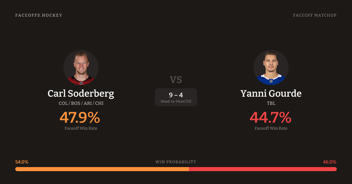 Carl Soderberg holds a +2.7% FO% edge overall. Look for Soderberg on neutral-zone draws (75% H2H, 4 meetings).