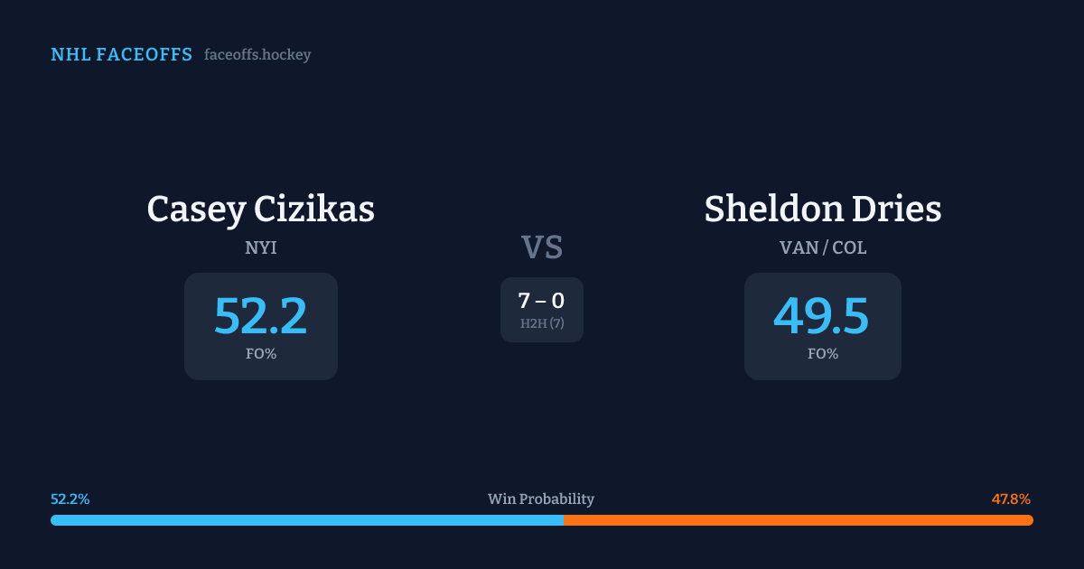 Sheldon Dries holds a +1.3% FO% edge overall. Look for Cizikas on defensive-zone draws (100% H2H, 3 meetings).
