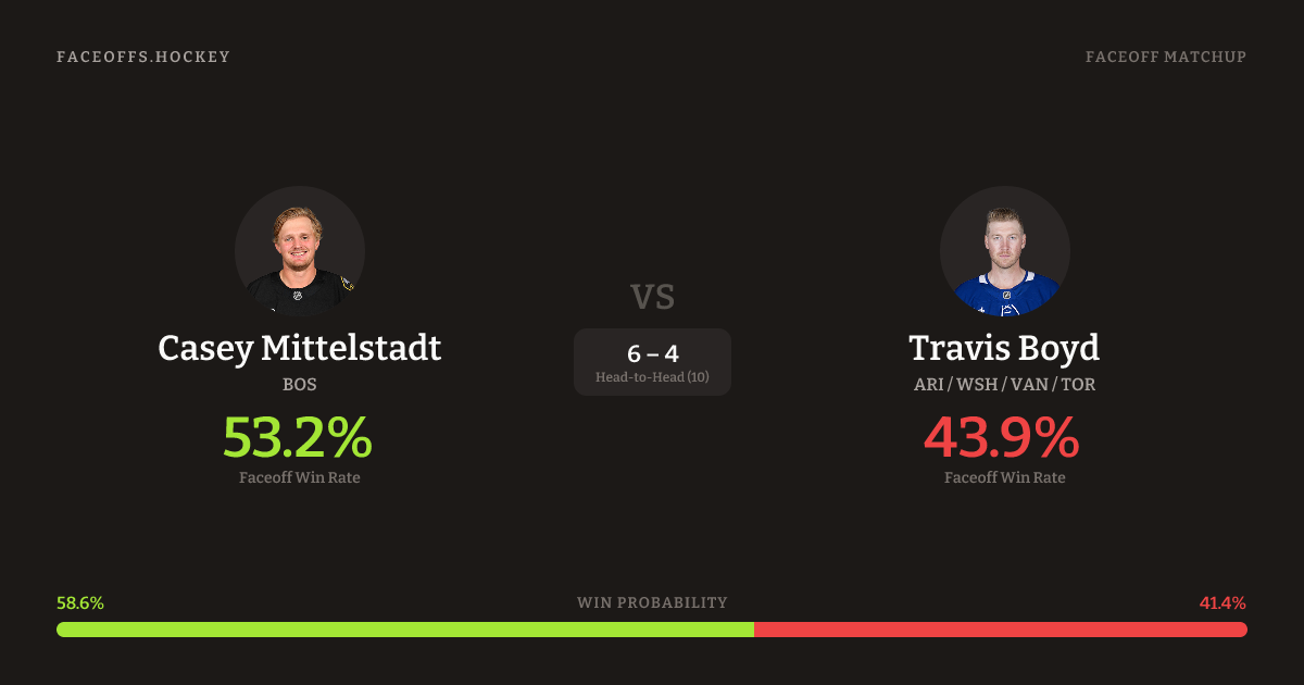These two are closely matched in overall FO% (44.7% vs 45.3%). Look for Mittelstadt on neutral-zone draws (67% H2H, 3 meetings). Mittelstadt wins 44.4% vs right-shot opponents — Boyd shoots right.
