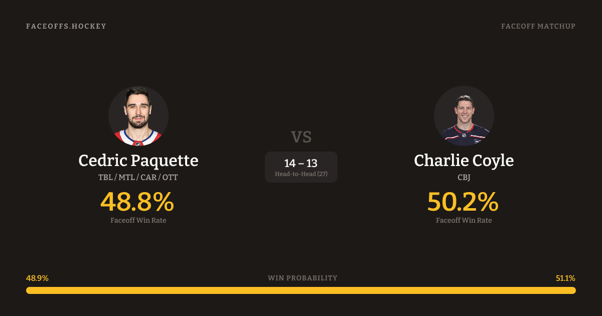 Cedric Paquette holds a +4.3% FO% edge overall. Look for Paquette on defensive-zone draws (67% H2H, 3 meetings). Paquette wins 46.7% vs right-shot opponents — Coyle shoots right.
