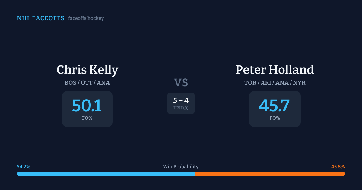 These two are closely matched in overall FO% (44.5% vs 45.4%). Kelly wins 41.5% vs left-shot opponents — Holland shoots left.