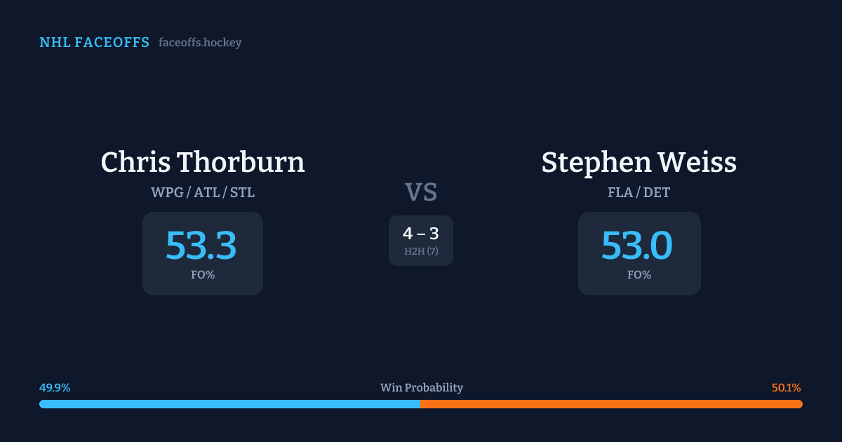 Stephen Weiss holds a +4.1% FO% edge overall. Look for Weiss on neutral-zone draws (67% H2H, 3 meetings).