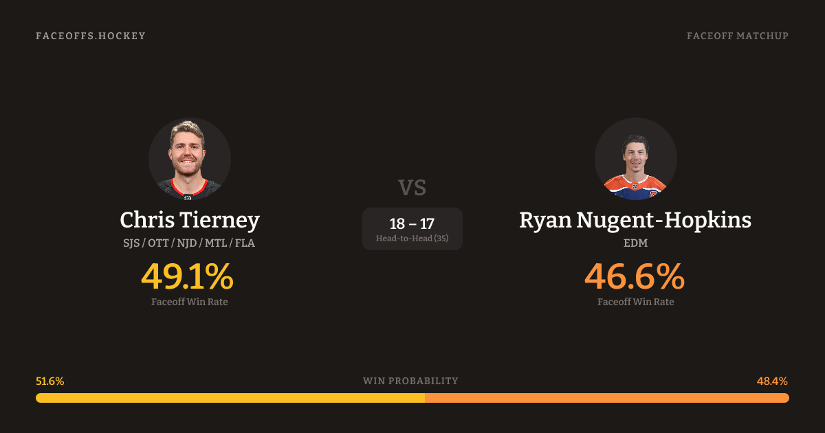 These two are closely matched in overall FO% (45.6% vs 45.6%). Look for Nugent-Hopkins on offensive-zone draws (100% H2H, 4 meetings). Tierney wins 45.3% vs left-shot opponents — Nugent-Hopkins shoots left.