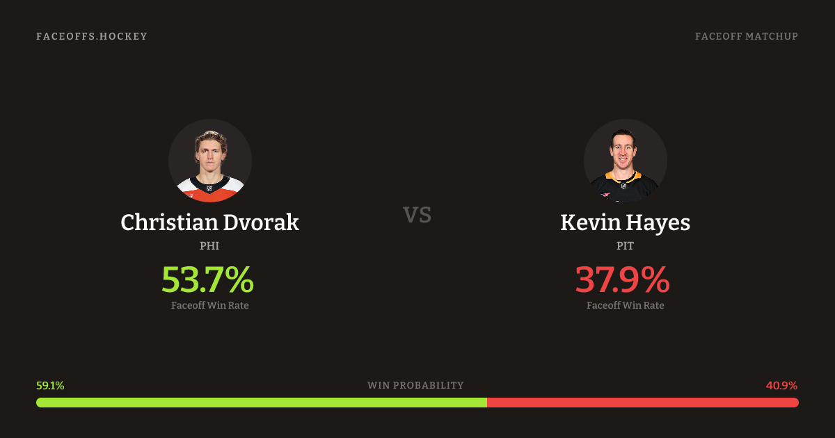 Christian Dvorak holds a +1.1% FO% edge overall. Look for Hayes on neutral-zone draws (75% H2H, 4 meetings). Dvorak wins 46.4% vs left-shot opponents — Hayes shoots left.