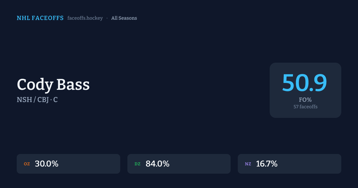 Cody Bass has a career faceoff win percentage of 50.9% across 57 faceoffs. Best zone: Defensive (84.0%).