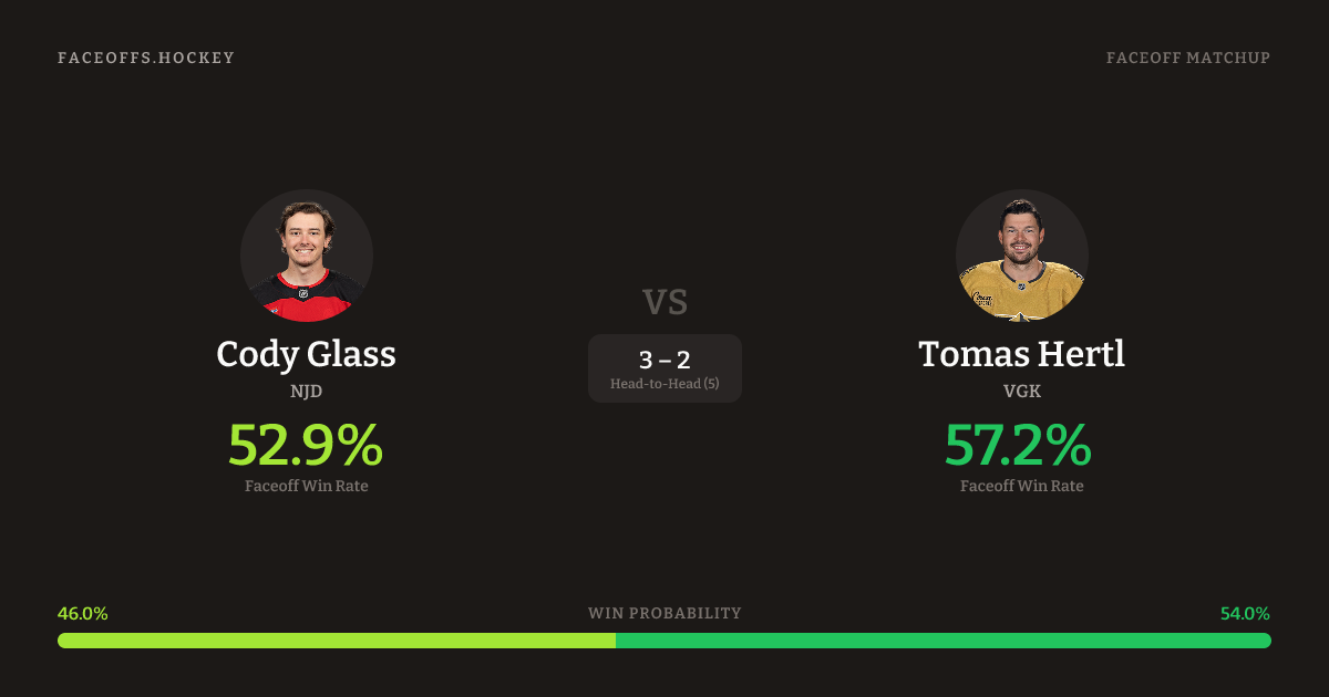 Tomas Hertl holds a +12.8% FO% edge overall. Look for Hertl on offensive-zone draws (67% H2H, 3 meetings). Glass wins 40.8% vs left-shot opponents — Hertl shoots left.