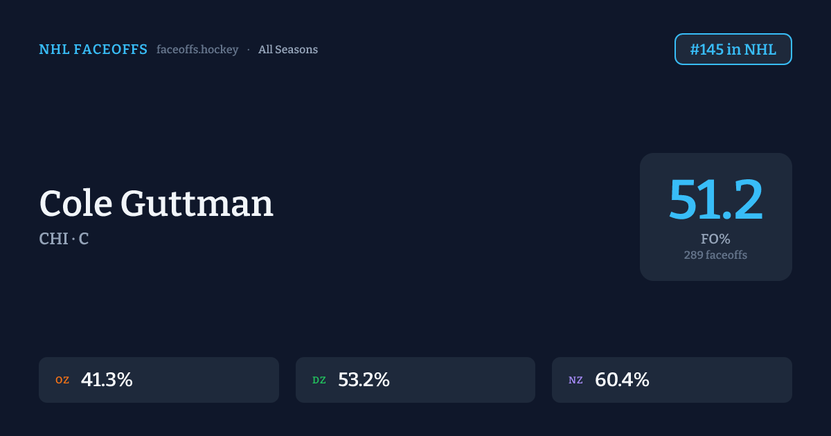 Cole Guttman has a career faceoff win percentage of 51.2% across 289 faceoffs. Best zone: Neutral (60.4%). Ranked #145 in the league.