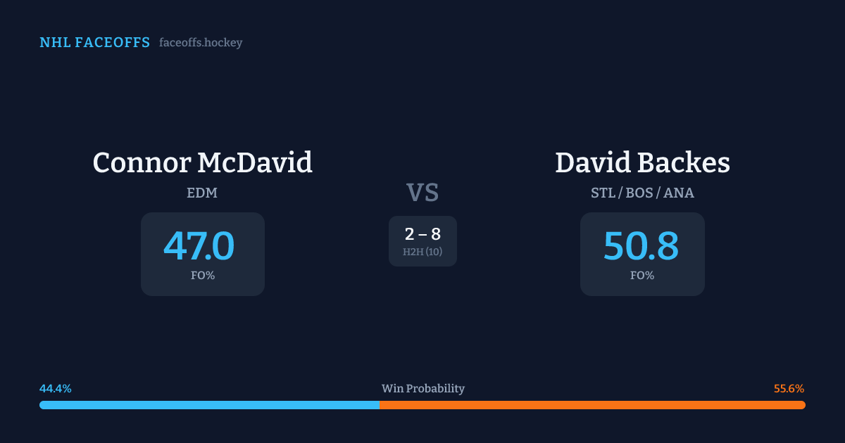 David Backes holds a +10.8% FO% edge overall. Look for Backes on defensive-zone draws (100% H2H, 4 meetings). McDavid wins 40.2% vs right-shot opponents — Backes shoots right.