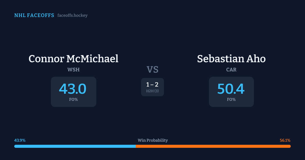 Sebastian Aho holds a +8.3% FO% edge overall. Look for McMichael on offensive-zone draws (56% H2H, 9 meetings). McMichael wins 45.3% vs left-shot opponents — Aho shoots left.