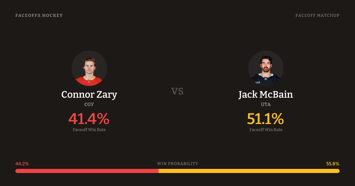 Jack McBain holds a +1.2% FO% edge overall. Look for McBain on offensive-zone draws (67% H2H, 3 meetings). Zary wins 42.9% vs left-shot opponents — McBain shoots left.