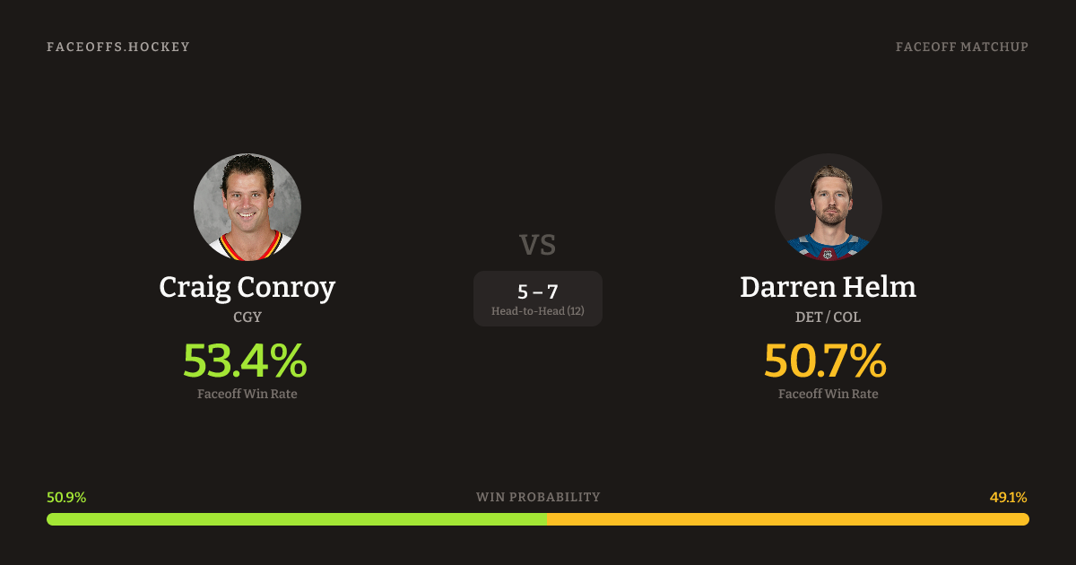 These two are closely matched in overall FO% (53.4% vs 52.6%). Look for Conroy on offensive-zone draws (100% H2H, 3 meetings). Conroy wins 53.8% vs left-shot opponents — Helm shoots left.