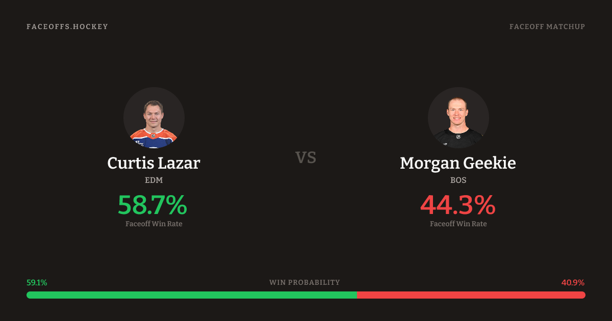 Curtis Lazar holds a +2.3% FO% edge overall. Lazar wins 55.7% vs right-shot opponents — Geekie shoots right.