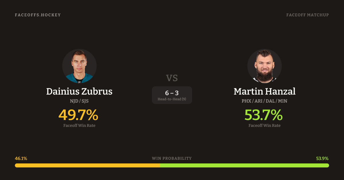 Martin Hanzal holds a +3.6% FO% edge overall. Look for Zubrus on defensive-zone draws (75% H2H, 4 meetings).
