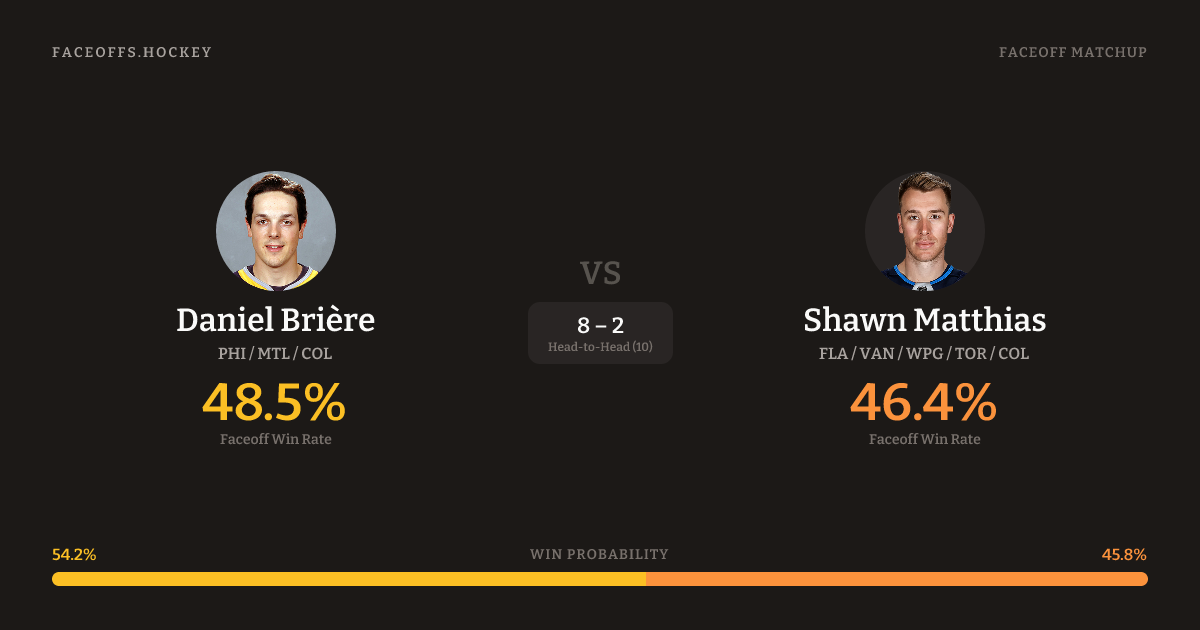 Brière shoots right. Matthias is 47.8% vs right-shot opponents (207).