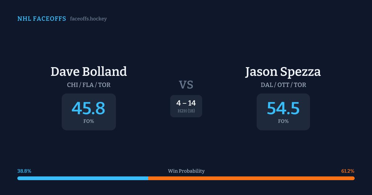 Jason Spezza holds a +9.1% FO% edge overall. Look for Spezza on neutral-zone draws (100% H2H, 4 meetings). Bolland wins 42.1% vs right-shot opponents — Spezza shoots right.