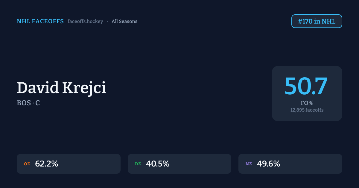 David Krejci has a career faceoff win percentage of 50.7% across 12,895 faceoffs. Best zone: Offensive (62.2%). Ranked #170 in the league.