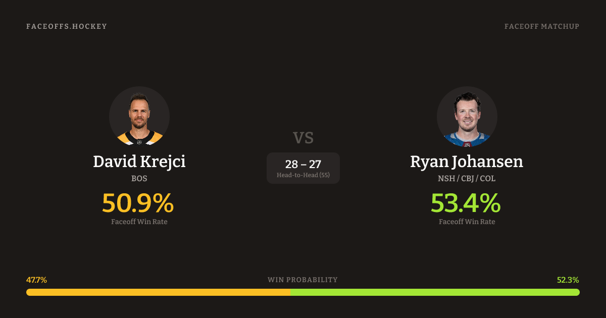 Ryan Johansen holds a +2.5% FO% edge overall. Look for Krejci on offensive-zone draws (80% H2H, 15 meetings).