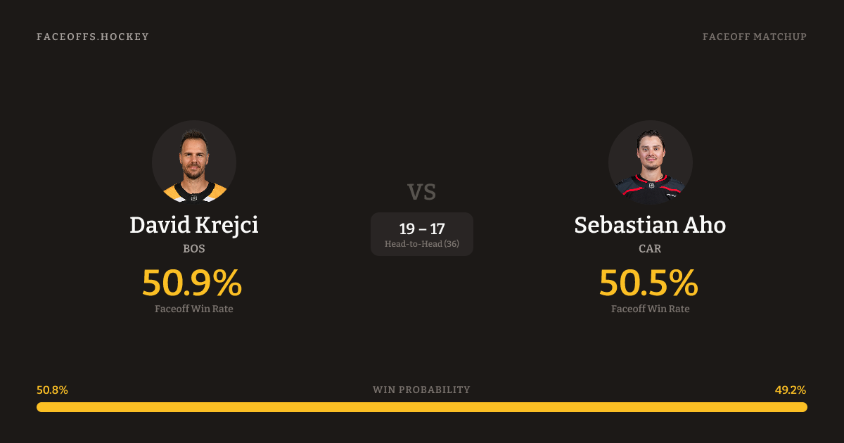 These two are closely matched in overall FO% (50.9% vs 51.3%). Look for Krejci on neutral-zone draws (79% H2H, 14 meetings).