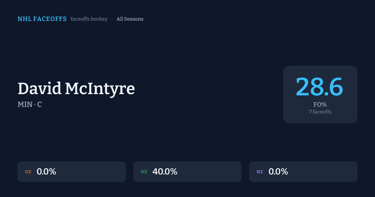 David McIntyre has a career faceoff win percentage of 28.6% across 7 faceoffs. Best zone: Defensive (40.0%).