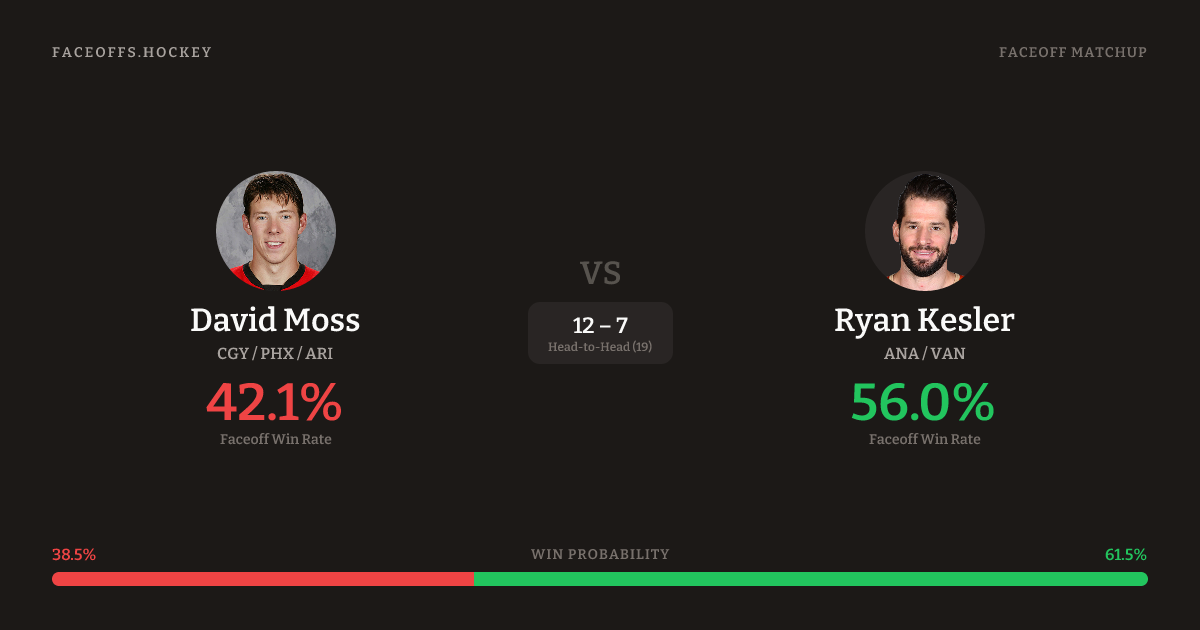 Ryan Kesler holds a +14.3% FO% edge overall. Look for Moss on defensive-zone draws (67% H2H, 6 meetings). Moss wins 44.6% vs right-shot opponents — Kesler shoots right.