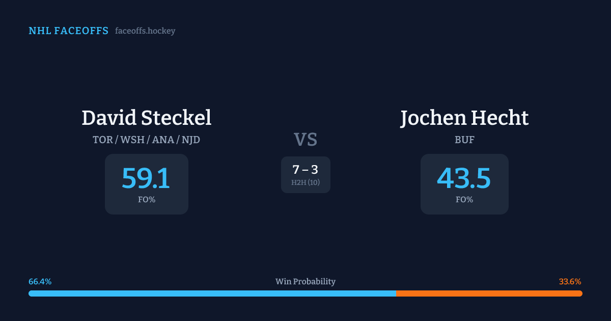 David Steckel holds a +12.7% FO% edge overall. Look for Steckel on defensive-zone draws (75% H2H, 4 meetings). Steckel wins 60.5% vs left-shot opponents — Hecht shoots left.