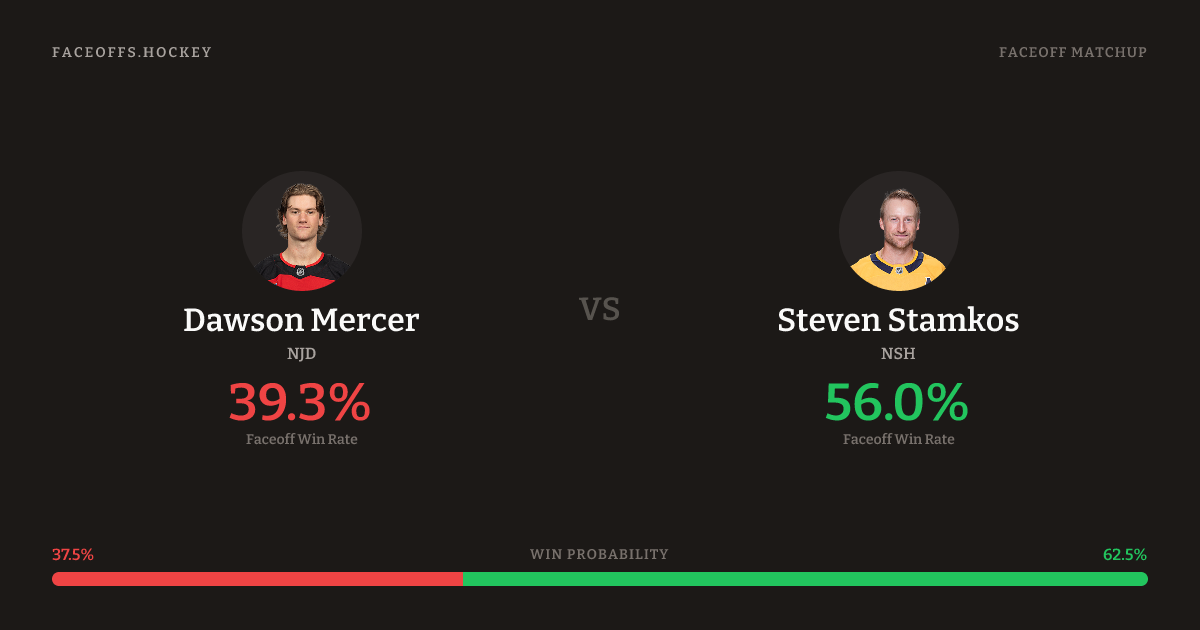 Steven Stamkos holds a +11.1% FO% edge overall. Look for Stamkos on neutral-zone draws (100% H2H, 3 meetings). Mercer wins 42.2% vs right-shot opponents — Stamkos shoots right.