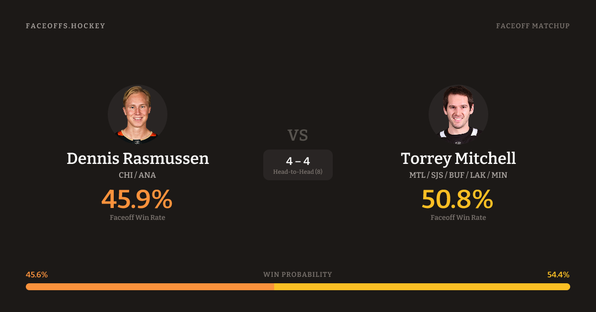Torrey Mitchell holds a +4.7% FO% edge overall. Look for Rasmussen on offensive-zone draws (67% H2H, 3 meetings). Rasmussen wins 45.5% vs right-shot opponents — Mitchell shoots right.
