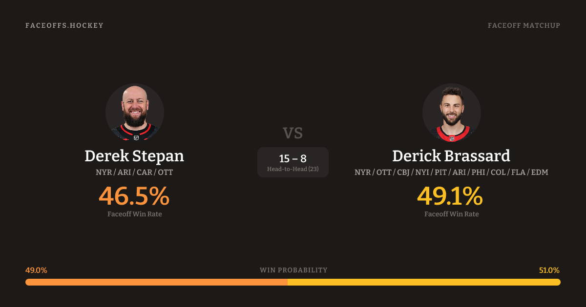 Derick Brassard holds a +2.6% FO% edge overall. Look for Stepan on offensive-zone draws (80% H2H, 5 meetings).
